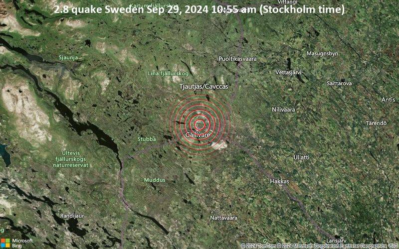 Earthquake data: Date & time: Sep 29, 2024 10:55 am (Stockholm time) local time (29 Sep 2024 08:55 GMT)Magnitude: 2.8 Depth: 0.0 km Epicenter latitude / longitude: 67.16°N / 20.68°E  ( Gaellivare kommun, Norrbotten, Sweden) Primary data source: EMSChttps://www.volcanodiscovery.com/earthquake/news/253707/Small-magnitude-28-earthquake-3-km-northeast-of-Gaellivare-Sweden.html