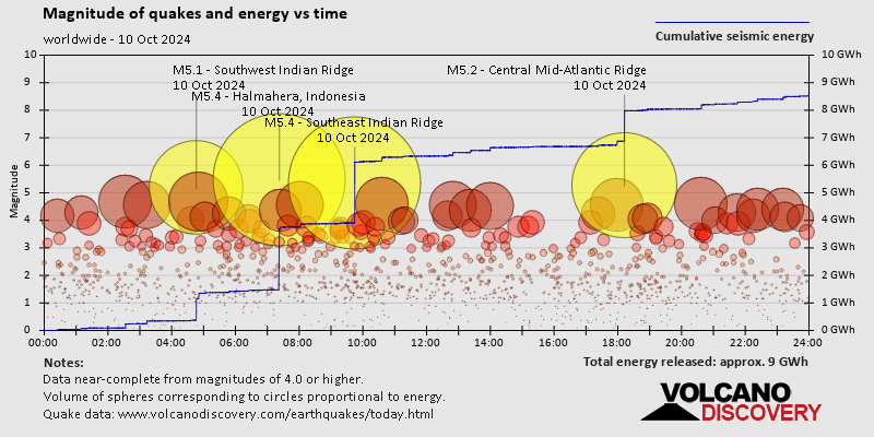 World Earthquake Report for Thursday, 10 October 2024 Worldwide earthquakes above magnitude 3 during the past 24 hours on 11 Oct 2024 Summary: 4 quakes 5.0+, 22 quakes 4.0+, 99 quakes 3.0+, 199 quakes 2.0+ (324 total)Magnitude 5+: 4 earthquakes Magnitude 4+: 22 earthquakes Magnitude 3+: 99 earthquakes Magnitude 2+: 199 earthquakes No quakes of magnitude 6 or higher 10 largest earthquakes in the world (10 Oct 2024)Thursday, Oct 10, 2024, at 04:44 pm (GMT +7) - Thursday, Oct 10, 2024, at 04:22 pm (GMT +9) - Thursday, Oct 10, 2024, at 05:12 pm (GMT -1) - Thursday, Oct 10, 2024, at 07:46 am (GMT +3) - Wednesday, Oct 9, 2024, at 08:51 pm (GMT -8) - Friday, Oct 11, 2024, at 09:37 am (GMT +13) - Thursday, Oct 10, 2024, at 12:13 am (Salta time) - Thursday, Oct 10, 2024, at 11:33 am (GMT +9) - Thursday, Oct 10, 2024, at 02:59 pm (Algiers time) - Friday, Oct 11, 2024, at 11:11 am (GMT +12) - Earthquakes reported feltThursday, Oct 10, 2024, at 02:59 pm (Algiers time) - Thursday, Oct 10, 2024, at 08:43 pm (Manila time) - Thursday, Oct 10, 2024, at 09:20 am (Chicago time) - Wednesday, Oct 9, 2024, at 06:46 pm (Los Angeles time) - Thursday, Oct 10, 2024, at 11:12 pm (Athens time) - Thursday, Oct 10, 2024, at 12:01 am (Santiago time) - Thursday, Oct 10, 2024, at 08:33 am (Zurich time) - Thursday, Oct 10, 2024, at 04:22 pm (GMT +9) - Wednesday, Oct 9, 2024, at 11:55 pm (Los Angeles time) - Wednesday, Oct 9, 2024, at 04:26 pm (Anchorage time) - Thursday, Oct 10, 2024, at 03:18 am (Mexico City time) - Earthquake stats  https://www.volcanodiscovery.com/earthquake/news/254589/World-Earthquake-Report-for-Thursday-10-October-2024.html