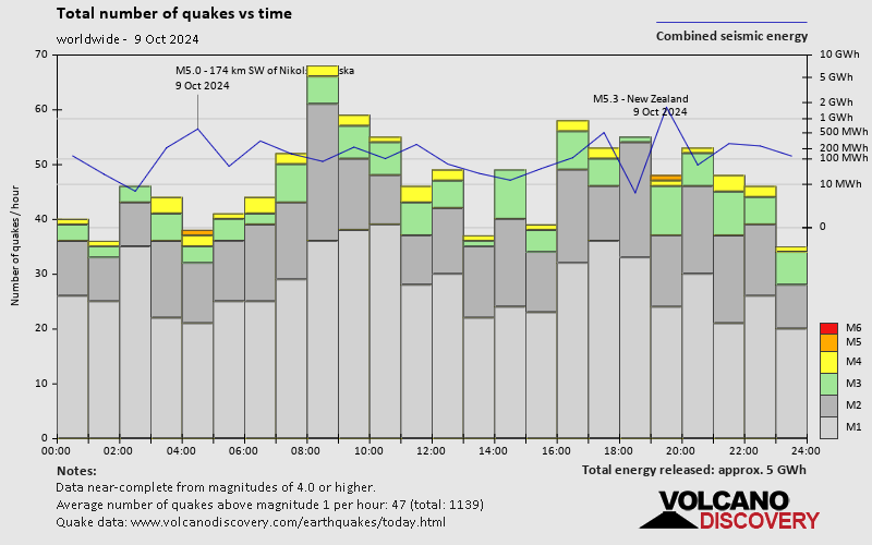 World Earthquake Report for Wednesday, 9 October 2024 Worldwide earthquakes above magnitude 3 during the past 24 hours on 10 Oct 2024 Summary: 2 quakes 5.0+, 30 quakes 4.0+, 112 quakes 3.0+, 244 quakes 2.0+ (388 total)Magnitude 5+: 2 earthquakes Magnitude 4+: 30 earthquakes Magnitude 3+: 112 earthquakes Magnitude 2+: 244 earthquakes No quakes of magnitude 6 or higher 10 largest earthquakes in the world (9 Oct 2024)Thursday, Oct 10, 2024, at 08:57 am (GMT +13) - Tuesday, Oct 8, 2024, at 06:41 pm (GMT -10) - Thursday, Oct 10, 2024, at 01:52 am (Shanghai time) - Tuesday, Oct 8, 2024, at 06:50 pm (GMT -12) - Thursday, Oct 10, 2024, at 05:57 am (GMT +7) - Thursday, Oct 10, 2024, at 10:26 am (GMT +13) - Wednesday, Oct 9, 2024, at 08:19 pm (GMT +9) - Wednesday, Oct 9, 2024, at 05:42 pm (GMT +8) - Thursday, Oct 10, 2024, at 05:22 am (Kamchatka time) - Wednesday, Oct 9, 2024, at 09:51 am (GMT +9) - Earthquakes reported feltTuesday, Oct 8, 2024, at 11:05 pm (Tijuana time) - Thursday, Oct 10, 2024, at 05:07 am (GMT +7) - Thursday, Oct 10, 2024, at 12:20 am (Athens time) - Wednesday, Oct 9, 2024, at 02:24 am (Madrid time) - Wednesday, Oct 9, 2024, at 02:44 am (Tijuana time) - Wednesday, Oct 9, 2024, at 03:38 pm (Belgrade time) - Thursday, Oct 10, 2024, at 05:22 am (Kamchatka time) - Wednesday, Oct 9, 2024, at 02:52 am (Rome time) - Tuesday, Oct 8, 2024, at 11:58 pm (GMT -6) - Tuesday, Oct 8, 2024, at 11:09 pm (Tijuana time) - Thursday, Oct 10, 2024, at 12:24 am (Athens time) - #12: Mag 5.3 New Zealand - 2 reportsThursday, Oct 10, 2024, at 08:57 am (GMT +13) - Wednesday, Oct 9, 2024, at 04:17 pm (Madrid time) - Thursday, Oct 10, 2024, at 04:22 am (Sydney time) - Tuesday, Oct 8, 2024, at 11:14 pm (Tijuana time) - Earthquake stats  https://www.volcanodiscovery.com/earthquake/news/254493/World-Earthquake-Report-for-Wednesday-9-October-2024.html