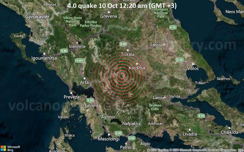 Earthquake data: Date & time: Oct 10, 2024 12:20 am (Athens time) local time (9 Oct 2024 21:20 GMT)Magnitude: 4.0 Depth: 10.0 km Epicenter latitude / longitude: 39.2°N / 21.66°E  ( Nomos Evrytanias, Central Greece, Greece) Primary data source: EMSChttps://www.volcanodiscovery.com/earthquake/news/254544/Moderate-magnitude-40-quake-hits-41-km-southwest-of-Trikala-Greece-after-midnight-.html