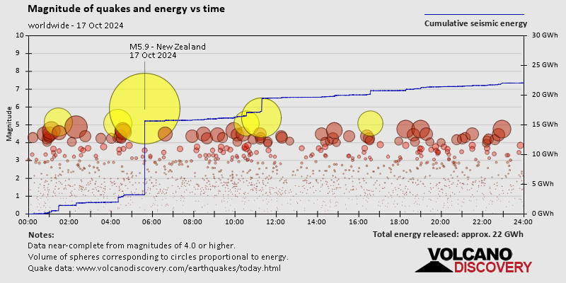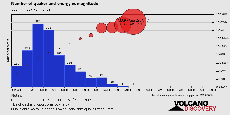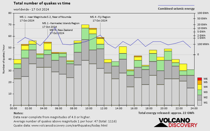 World Earthquake Report for Thursday, 17 October 2024 Worldwide earthquakes above magnitude 3 during the past 24 hours on 18 Oct 2024 Summary: 6 quakes 5.0+, 48 quakes 4.0+, 115 quakes 3.0+, 231 quakes 2.0+ (400 total)Magnitude 5+: 6 earthquakes Magnitude 4+: 48 earthquakes Magnitude 3+: 115 earthquakes Magnitude 2+: 231 earthquakes No quakes of magnitude 6 or higher 10 largest earthquakes in the world (17 Oct 2024)Wednesday, Oct 16, 2024, at 05:37 pm (GMT -12) - Thursday, Oct 17, 2024, at 11:18 pm (GMT +12) - Thursday, Oct 17, 2024, at 04:20 pm (GMT +12) - Thursday, Oct 17, 2024, at 02:33 pm (GMT -2) - Thursday, Oct 17, 2024, at 11:33 pm (GMT +13) - Thursday, Oct 17, 2024, at 01:18 pm (GMT +11) - Thursday, Oct 17, 2024, at 11:45 pm (GMT +9) - Friday, Oct 18, 2024, at 06:01 am (Efate time) - Thursday, Oct 17, 2024, at 02:28 pm (GMT +13) - Friday, Oct 18, 2024, at 12:17 am (GMT +6) - Earthquakes reported feltThursday, Oct 17, 2024, at 12:10 pm (Addis Ababa time) - Friday, Oct 18, 2024, at 12:28 am (Kolkata time) - Friday, Oct 18, 2024, at 12:43 am (GMT +6) - Friday, Oct 18, 2024, at 01:18 am (Podgorica time) - Thursday, Oct 17, 2024, at 10:50 am (Havana time) - Wednesday, Oct 16, 2024, at 11:40 pm (Santiago time) - Thursday, Oct 17, 2024, at 04:07 am (Athens time) - Thursday, Oct 17, 2024, at 05:14 pm (Bogota time) - Thursday, Oct 17, 2024, at 11:29 am (Istanbul time) - Thursday, Oct 17, 2024, at 08:13 am (Jakarta time) - Thursday, Oct 17, 2024, at 05:24 am (Athens time) - Thursday, Oct 17, 2024, at 09:50 am (Athens time) - Thursday, Oct 17, 2024, at 06:10 am (Athens time) - Wednesday, Oct 16, 2024, at 11:36 pm (Bogota time) - Friday, Oct 18, 2024, at 06:01 am (Efate time) - Thursday, Oct 17, 2024, at 10:31 am (Mexico City time) - Thursday, Oct 17, 2024, at 05:57 am (Athens time) - Thursday, Oct 17, 2024, at 11:39 am (Istanbul time) - Thursday, Oct 17, 2024, at 06:37 am (Madrid time) - Thursday, Oct 17, 2024, at 04:35 pm (Almaty time) - Thursday, Oct 17, 2024, at 02:46 pm (Canary time) - Earthquake stats  https://www.volcanodiscovery.com/earthquake/news/255192/World-Earthquake-Report-for-Thursday-17-October-2024.html