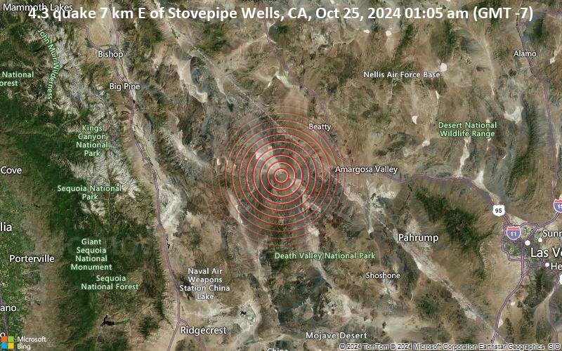 Earthquake data: Date & time: Oct 25, 2024 01:05 am (Los Angeles time) local time (25 Oct 2024 08:05 GMT)Magnitude: 4.3 Depth: 1.6 km Epicenter latitude / longitude: 36.6°N / 117.07°W  ( Inyo, California, United States) Primary data source: USGShttps://www.volcanodiscovery.com/earthquake/news/255906/Magnitude-43-earthquake-strikes-near-Beatty-Nye-County-Nevada-USA.html