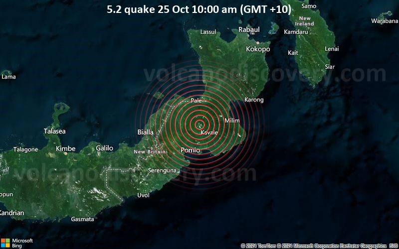 Earthquake data: Date & time: Oct 25, 2024 10:00 am (GMT +10) local time (25 Oct 2024 00:00 GMT)Magnitude: 5.2 Depth: 35.0 km Epicenter latitude / longitude: 5.23°S / 151.55°E  ( Papua New Guinea) Primary data source: USGShttps://www.volcanodiscovery.com/earthquake/news/255877/Significant-magnitude-52-quake-hits-123-km-southwest-of-Kokopo-Papua-New-Guinea-in-the-morning-.html
