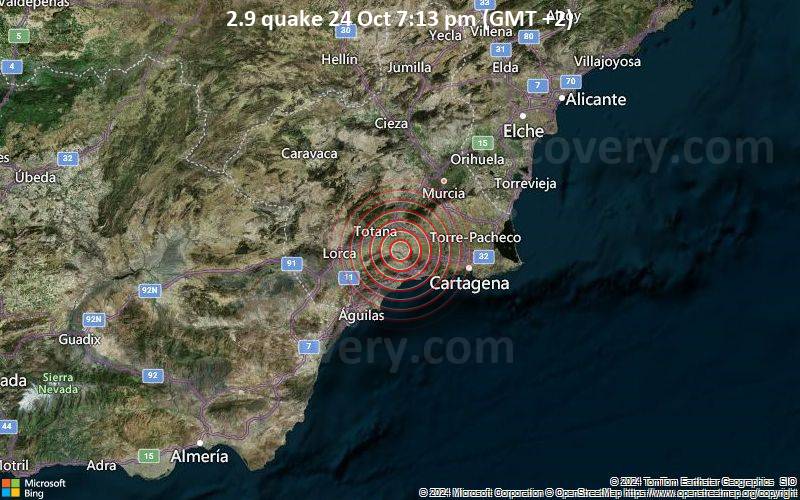 Earthquake data: Date & time: Oct 24, 2024 07:13 pm (Madrid time) local time (24 Oct 2024 17:13 GMT)Magnitude: 2.9 Depth: 5.0 km Epicenter latitude / longitude: 37.69°N / 1.37°W  ( Murcia, Murcia, Spain) Primary data source: EMSChttps://www.volcanodiscovery.com/earthquake/news/255846/Small-earthquake-of-magnitude-29-just-reported-11-km-northwest-of-Mazarron-Spain.html