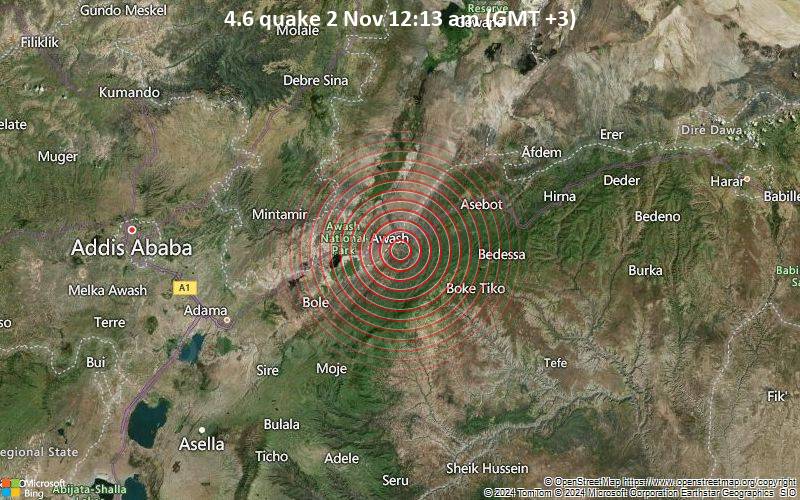 Earthquake data: Date & time: Nov 2, 2024 12:13 am (Addis Ababa time) local time (1 Nov 2024 21:13 GMT)Magnitude: 4.6 Depth: 10.0 km Epicenter latitude / longitude: 8.93°N / 40.22°E  ( Harari, Ethiopia) Primary data source: USGShttps://www.volcanodiscovery.com/earthquake/news/256575/Moderate-earthquake-of-magnitude-46-reported-34-km-east-of-Metehara-Ethiopia.html