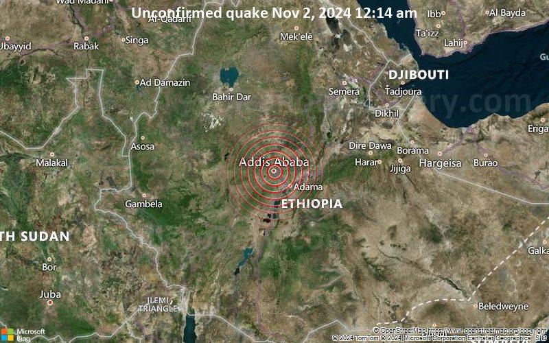 Earthquake data: Date & time: Nov 2, 2024 12:14 am (GMT +3) local time (1 Nov 2024 21:14 GMT)Magnitude: unspecified Depth: unspecified Epicenter latitude / longitude: 9.02°N / 38.75°E  ( Ethiopia) Primary data source: VolcanoDiscoveryhttps://www.volcanodiscovery.com/earthquake/news/256573/Seismic-like-event-possible-earthquake-reported-few-minutes-ago-near-Addis-Ababa-Addis-Ababa-Ethiopi.html