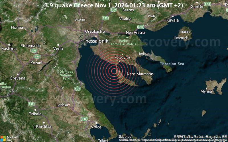 Small tremor of magnitude 3.9 just reported 64 km southeast of Thessaloniki, Greece 3.9 quake Greece Nov 1, 2024 01:23 am (GMT +2) A shallow magnitude 3.9 earthquake was reported early morning near Thessaloniki, Greece. According to the European-Mediterranean Seismological Centre (EMSC), the quake hit on Friday, November 1st, 2024, at 1:23 am local time at a shallow depth of 10 km. Shallow earthquakes are felt more strongly than deeper ones as they are closer to the surface. The exact magnitude, epicenter, and depth of the quake might be revised within the next few hours or minutes as seismologists review data and refine their calculations, or as other agencies issue their report. Our monitoring service identified a second report from the German Research Centre for Geosciences (GFZ) which listed the quake at magnitude 4.4. Based on the preliminary seismic data, the quake should not have caused any significant damage, but was probably felt by many people as light vibration in the area of the epicenter. Weak shaking might have been felt in Portes (pop. 210) located 9 km from the epicenter. Other towns or cities near the epicenter where the quake might have been felt as very weak shaking include Kalamaria (pop. 91,600) located 57 km from the epicenter, Pylaia (pop. 34,600) 57 km away, Sykiés (pop. 45,000) 63 km away, Thessaloniki (pop. 354,300) 64 km away, Polichni (pop. 39,800) 65 km away, Stavroupoli (pop. 46,000) 66 km away, Evosmos (pop. 74,700) 67 km away, and Katerini (pop. 53,300) 67 km away.