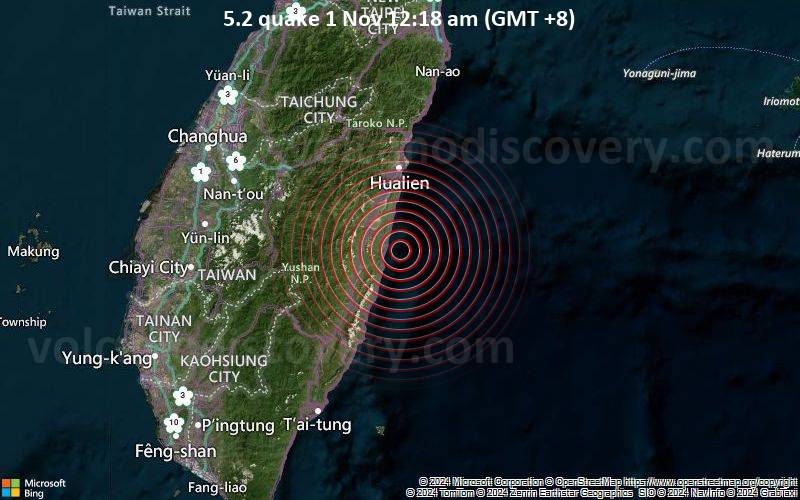 Significant magnitude 5.2 quake hits 45 km south of Hualien City, Taiwan after midnight 5.2 quake 1 Nov 12:18 am (GMT +8) Just 21 minutes ago, a 5.2-magnitude earthquake struck near Hualien City, Hualien, Taiwan. The tremor was recorded after midnight on Friday, November 1st, 2024, at 12:18 am local time, at a shallow depth of 10 km below the surface. The event was filed by the United States Geological Survey, the first seismological agency to report it. Our monitoring service identified a second report from The Incorporated Research Institutions for Seismology (IRIS) which listed the quake at magnitude 5.2 as well. Other agencies reporting the same quake include the German Research Centre for Geosciences (GFZ) at magnitude 4.9, and the European-Mediterranean Seismological Centre (EMSC) at magnitude 5.2. Based on the preliminary seismic data, the quake was probably felt by many people in the area of the epicenter. It should not have caused significant damage, other than objects falling from shelves, broken windows, etc. In Hualien City (pop. 350,500) located 45 km from the epicenter, the quake should have been felt as light shaking. Weak shaking might have been felt in Puli (pop. 86,400) located 78 km from the epicenter, Lugu (pop. 19,600) 88 km away, Taitung City (pop. 109,600) 102 km away, Nantou City (pop. 105,700) 102 km away, Douliu (pop. 104,700) 108 km away, Yuanlin (pop. 124,700) 112 km away, and Taichung (pop. 1,040,700) 113 km away. VolcanoDiscovery will automatically update magnitude and depth if these change and follow up if other significant news about the quake become available. If you’re in the area, please send us your experience through our reporting mechanism, either online or via our mobile app. This will help us provide more first-hand updates to anyone around the globe who wants to know more about this quake.