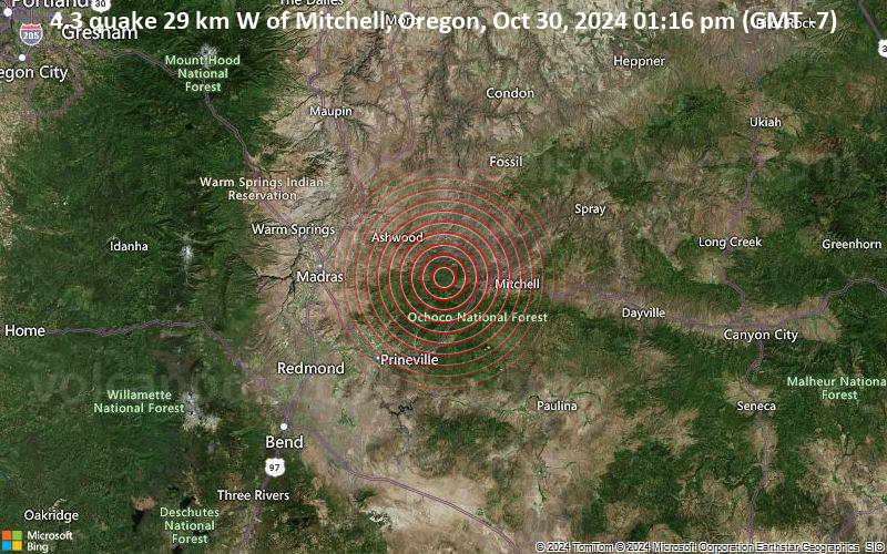 Magnitude 4.3 earthquake strikes near Redmond, Deschutes County, Oregon, USA 4.3 quake 29 km W of Mitchell, Oregon, Oct 30, 2024 01:16 pm (GMT -7) The United States Geological Survey reported a magnitude 4.3 quake in the United States near Redmond, Deschutes County, Oregon, only 2 minutes ago. The earthquake hit around noon on Wednesday, October 30th, 2024, at 1:16 pm local time at a very shallow depth of 5 miles. The exact magnitude, epicenter, and depth of the quake might be revised within the next few hours or minutes as seismologists review data and refine their calculations, or as other agencies issue their report. Our monitoring service identified a second report from the European-Mediterranean Seismological Centre (EMSC) which listed the quake at magnitude 4.3 as well. Based on the preliminary seismic data, the quake should not have caused any significant damage, but was probably felt by many people as light vibration in the area of the epicenter. Weak shaking might have been felt in Mitchell (pop. 120) located 18 miles from the epicenter, Prineville (pop. 9,500) 25 miles away, and Madras (pop. 6,700) 30 miles away. Other towns or cities near the epicenter where the quake might have been felt as very weak shaking include Culver (pop. 1,400) located 34 miles from the epicenter, Terrebonne (pop. 1,300) 36 miles away, Warm Springs (pop. 2,900) 38 miles away, Redmond (pop. 28,700) 39 miles away, Bend (pop. 87,000) 54 miles away, and Deschutes River Woods (pop. 5,100) 59 miles away. VolcanoDiscovery will automatically update magnitude and depth if these change and follow up if other significant news about the quake become available. If you’re in the area, please send us your experience through our reporting mechanism, either online or via our mobile app. This will help us provide more first-hand updates to anyone around the globe who wants to know more about this quake.