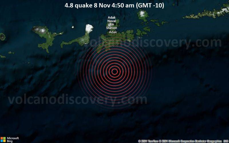 Earthquake data: Date & time: Nov 8, 2024 04:50 am (GMT -10) local time (8 Nov 2024 14:50 GMT)Magnitude: 4.8 Depth: 35.0 km Epicenter latitude / longitude: 51.38°N / 176.64°W  (Aleutians West, Alaska, United States) Primary data source: USGShttps://www.volcanodiscovery.com/earthquake/news/257307/Magnitude-48-earthquake-strikes-near-Adak-Aleutians-West-Alaska-USA.html