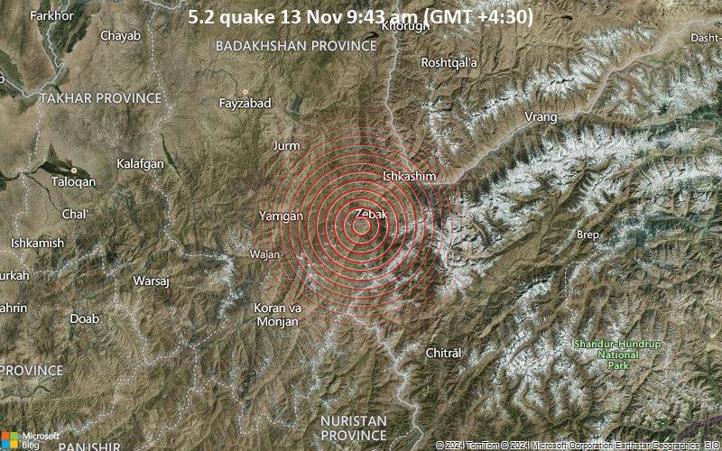 Moderate yet deep magnitude 5.2 quake hits 95 km southeast of Faizabad, Afghanistan in the morning 5.2 quake 13 Nov 9:43 am (GMT +4:30) An intermediate to deep magnitude 5.2 earthquake was reported in the morning near Faizabad, Faīẕābād, Badakhshan, Afghanistan. According to the German Research Centre for Geosciences (GFZ), the quake hit on Wednesday, November 13th, 2024, at 9:13 am local time at an intermediate to considerable depth of 217 km. The strength of the earthquake may have been tempered by its relative great depth below the surface, which makes it feel weaker in absolute terms. The exact magnitude, epicenter, and depth of the quake might be revised within the next few hours or minutes as seismologists review data and refine their calculations, or as other agencies issue their report. Our monitoring service identified a second report from the European-Mediterranean Seismological Centre (EMSC) which listed the quake at magnitude 5.2 as well. Towns or cities near the epicenter where the quake might have been felt as very weak shaking include Ashkāsham (pop. 12,100) located 33 km from the epicenter, Ishqoshim (pop. 26,000) 41 km away, Jurm (pop. 12,100) 59 km away, and Faizabad (pop. 44,400) 95 km away. VolcanoDiscovery will automatically update magnitude and depth if these change and follow up if other significant news about the quake become available. If you’re in the area, please send us your experience through our reporting mechanism, either online or via our mobile app. This will help us provide more first-hand updates to anyone around the globe who wants to know more about this quake.