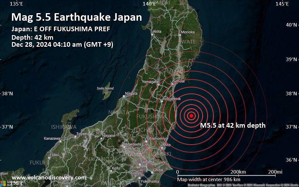 Earthquake data: Date & time: Dec 28, 2024 04:10 am (GMT +9) local time (27 Dec 2024 19:10 GMT)Magnitude: 5.5 Depth: 41.7 km Epicenter latitude / longitude: 37.34°N / 141.58°E  ( Fukushima, Japan) Primary data source: NIEDhttps://www.volcanodiscovery.com/earthquake/news/260892/Significant-55-quake-hits-near-Iwaki-Iwaki-shi-Fukushima-Japan.html