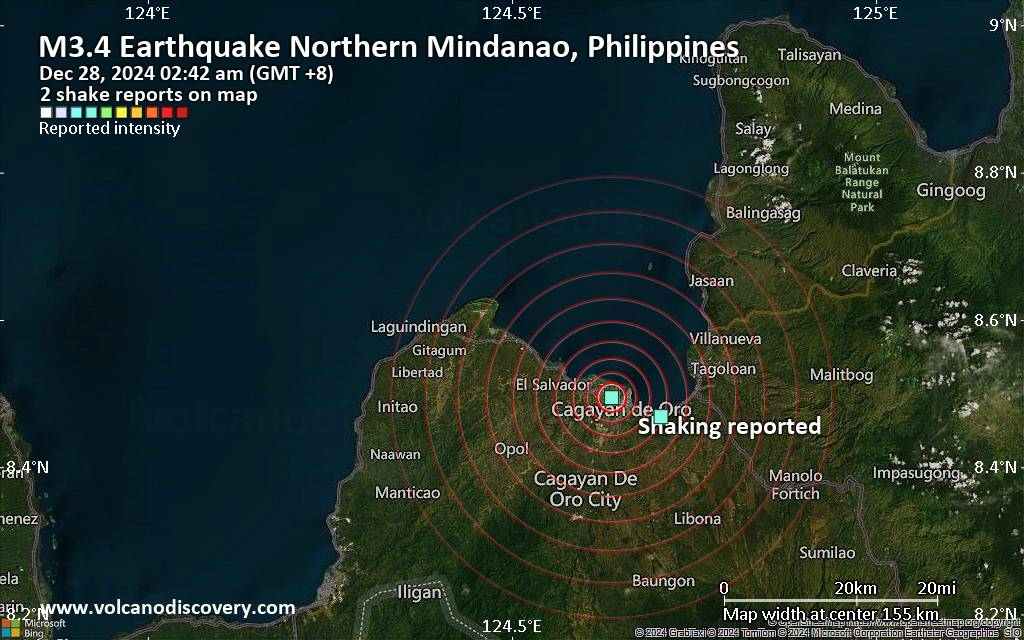 Earthquake data: Date & time: Dec 28, 2024 02:42 am (GMT +8) local time (27 Dec 2024 18:42 GMT)Magnitude: unspecified Depth: unspecified Epicenter latitude / longitude: 8.5°N / 124.64°E  ( Northern Mindanao, Philippines) Primary data source: VolcanoDiscoveryhttps://www.volcanodiscovery.com/earthquake/news/260884/Seismic-like-event-possible-earthquake-reported-few-minutes-ago-near-Cagayan-de-Oro-Northern-Mindana.html