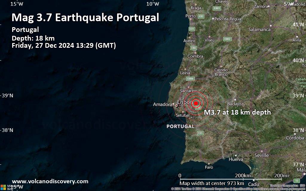Earthquake data: Date & time: Dec 27, 2024 01:29 pm (Lisbon time) local time (27 Dec 2024 13:29 GMT)Magnitude: 3.7 Depth: 17.5 km Epicenter latitude / longitude: 38.78°N / 8.42°W  ( Montemor-O-Novo, Évora, Portugal) Primary data source: EMSChttps://www.volcanodiscovery.com/earthquake/news/260870/Small-magnitude-37-quake-hits-62-km-east-of-Lissabon-Portugal-around-noon-.html