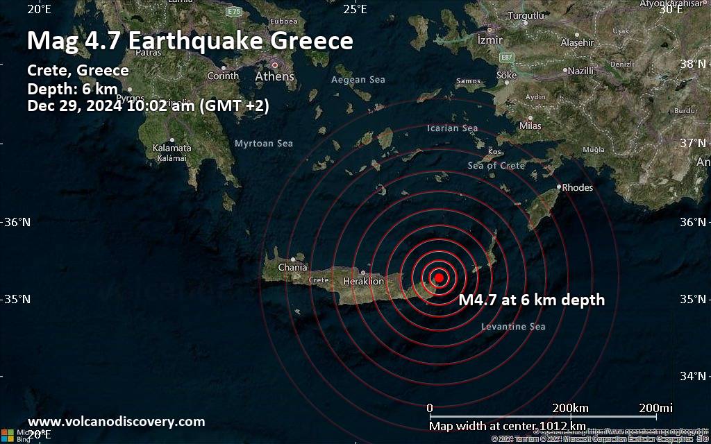 Earthquake data: Date & time: Dec 29, 2024 10:02 am (GMT +2) local time (29 Dec 2024 08:02 GMT)Magnitude: 4.7 Depth: 6.0 km Epicenter latitude / longitude: 35.28°N / 26.32°E  ( Crete, Greece) Primary data source: EMSChttps://www.volcanodiscovery.com/earthquake/news/260999/Moderate-earthquake-of-magnitude-47-just-reported-21-km-northeast-of-Sitia-Greece.html