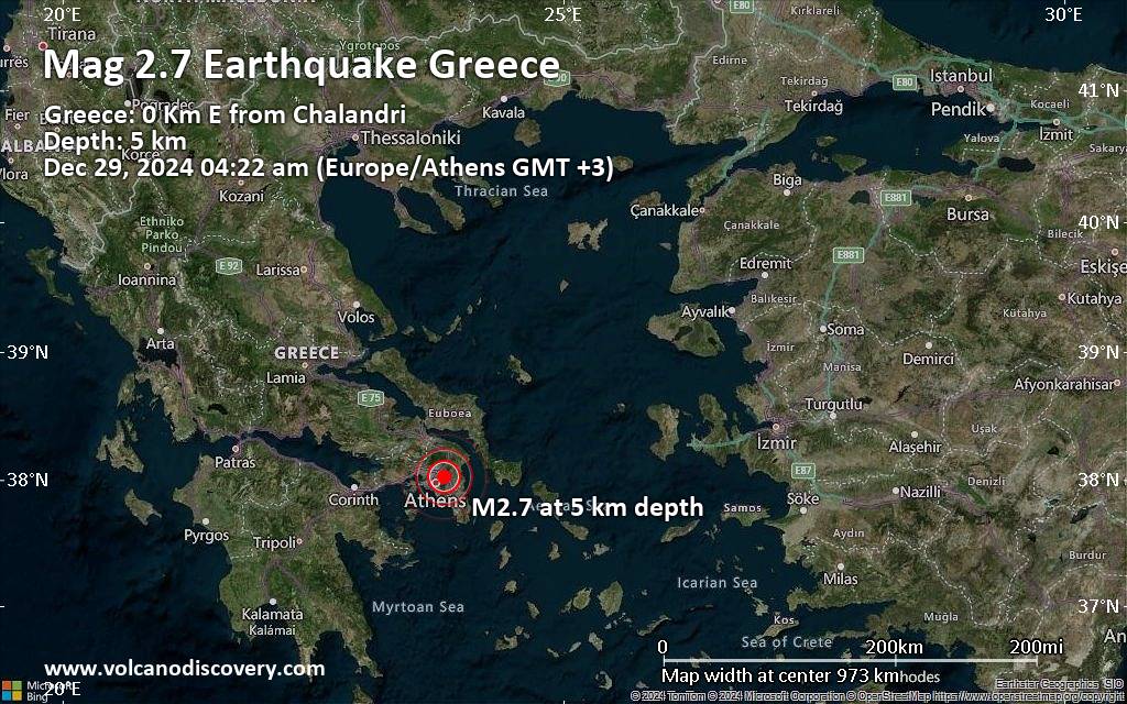 Small tremor of magnitude 2.7 just reported 8 km northeast of Athens, Greece An earthquake of magnitude 2.7 occurred only 11 minutes ago 8 km northeast of Athens, Greece, the National Observatory of Athens (NOA) reported. The quake hit at a very shallow depth of 5 km beneath the epicenter near Athens, Nomarchía Athínas, Attica, Greece, early morning on Sunday, December 29th, 2024, at 3:22 am local time. The exact magnitude, epicenter, and depth of the quake might be revised within the next few hours or minutes as seismologists review data and refine their calculations, or as other agencies issue their report. A second report was later issued by the European-Mediterranean Seismological Centre (EMSC), which listed it as a magnitude 3.3 earthquake. Based on the preliminary seismic data, the quake should not have caused any significant damage, but was probably felt by many people as light vibration in the area of the epicenter. Weak shaking might have been felt in Chalandri (pop. 74,200) located 1 km from the epicenter, and Agia Paraskevi (pop. 59,700) 2 km away. Other towns or cities near the epicenter where the quake might have been felt as very weak shaking include Marousi (pop. 72,300) located 3 km from the epicenter, Iraklion (pop. 49,600) 5 km away, Galatsi (pop. 59,300) 5 km away, Zografos (pop. 71,000) 6 km away, Athens (pop. 664,000) 8 km away, Acharnes (pop. 99,300) 10 km away, Peristeri (pop. 140,000) 11 km away, and Piraeus (pop. 163,700) 17 km away.