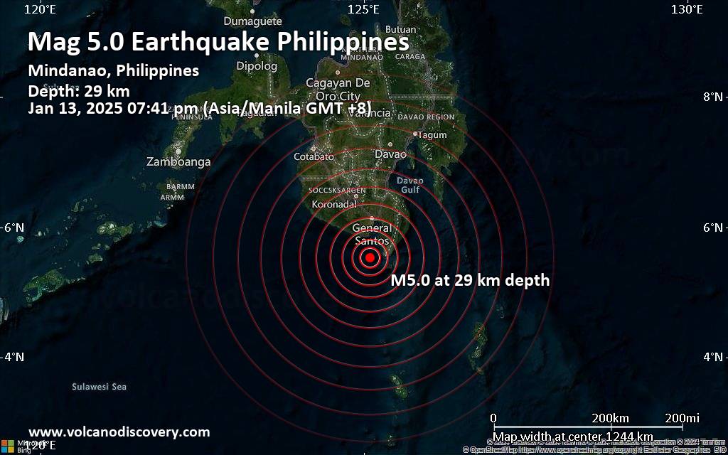 Earthquake data: Date & time: Jan 13, 2025 07:41 pm (Manila time) local time (13 Jan 2025 11:41 GMT)Magnitude: 5.0 Depth: 28.0 km Epicenter latitude / longitude: 5.56°N / 125.12°E  (Province of Sarangani, Soccsksargen, Philippines) Primary data source: BMKGhttps://www.volcanodiscovery.com/earthquake/news/262234/Significant-50-quake-hits-near-Glan-Province-of-Sarangani-Soccsksargen-Philippines.html