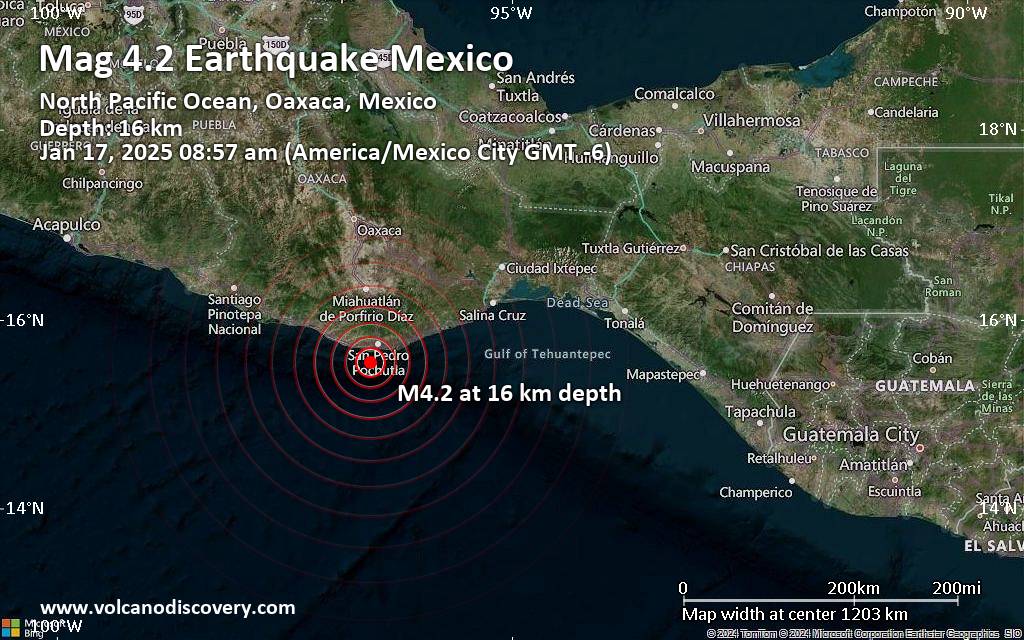 Earthquake data: Date & time: Jan 17, 2025 08:57 am (Mexico City time) local time (17 Jan 2025 14:57 GMT)Magnitude: 4.2 Depth: 16.0 km Epicenter latitude / longitude: 15.55°N / 96.56°W  (Santa María Tonameca, Oaxaca, Mexico) Primary data source: SSNhttps://www.volcanodiscovery.com/earthquake/news/262574/Magnitude-42-earthquake-strikes-near-Puerto-Escondido-San-Pedro-Mixtepec-Dto-22-Oaxaca-Mexico.html