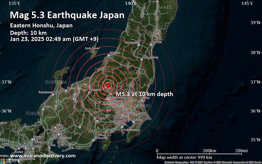 Earthquake data: Date & time: Jan 23, 2025 02:49 am (GMT +9) local time (22 Jan 2025 17:49 GMT)Magnitude: 5.3 Depth: 10.00 km Epicenter latitude / longitude: 36.87°N / 139.02°E  ( Tone-gun, Gunma, Japan) Primary data source: BMKGhttps://www.volcanodiscovery.com/earthquake/news/262944/Magnitude-53-earthquake-strikes-near-Numata-Gunma-Japan.html
