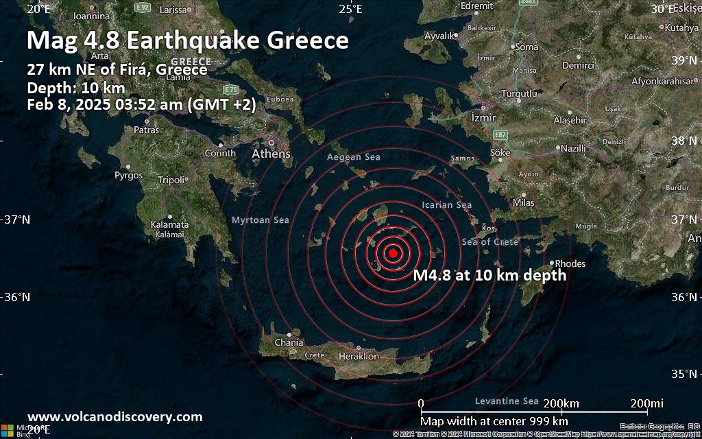 Earthquake data: Date & time: Feb 8, 2025 03:52 am (GMT +2) local time (8 Feb 2025 01:52 GMT)Magnitude: 4.8 Depth: 10.00 km Epicenter latitude / longitude: 36.56°N / 25.68°E  ( Greece) Primary data source: USGShttps://www.volcanodiscovery.com/earthquake/news/264244/Moderate-magnitude-48-earthquake-29-km-northeast-of-Oia-Greece.html