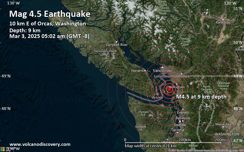 Magnitude 4.5 earthquake strikes near Bellingham, Whatcom County, Washington, USA An earthquake of magnitude 4.5 occurred only 3 minutes ago 19 miles southwest of Bellingham, Washington, United States, the United States Geological Survey reported. The quake hit at a very shallow depth of 5.6 miles beneath the epicenter near Bellingham, Whatcom County, Washington, USA, early morning on Monday, March 3rd, 2025, at 5:02 am local time. The exact magnitude, epicenter, and depth of the quake might be revised within the next few hours or minutes as seismologists review data and refine their calculations, or as other agencies issue their report. Based on the preliminary seismic data, the quake was probably felt by many people in the area of the epicenter. It should not have caused significant damage, other than objects falling from shelves, broken windows, etc. In Orcas (pop. 390) located 6 miles from the epicenter, and Anacortes (pop. 16,400) 10 miles away, the quake should have been felt as light shaking. Weak shaking might have been felt in Bellingham (pop. 85,100) located 19 miles from the epicenter, Oak Harbor (pop. 22,700) 22 miles away, Mount Vernon (pop. 34,100) 25 miles away, and White Rock (pop. 66,500) 30 miles away. Other towns or cities near the epicenter where the quake might have been felt as very weak shaking include Haller (pop. 18,900) located 41 miles from the epicenter, Port Angeles (pop. 19,400) 44 miles away, Marysville (pop. 66,800) 47 miles away, and Everett (pop. 108,000) 51 miles away. VolcanoDiscovery will automatically update magnitude and depth if these change and follow up if other significant news about the quake become available. If you’re in the area, please send us your experience through our reporting mechanism, either online or via our mobile app. This will help us provide more first-hand updates to anyone around the globe who wants to know more about this quake.