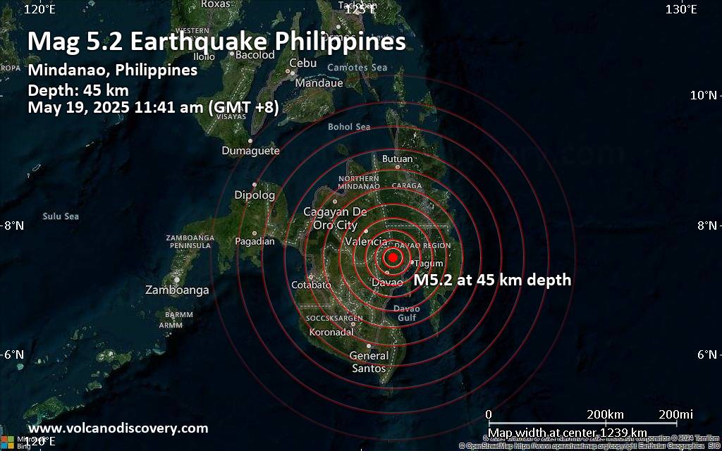 Significant 5.2 quake hits near Panabo, Davao del Norte, Davao, Philippines An earthquake of magnitude 5.2 occurred in the morning on Monday, May 19th, 2025, at 11:41 am local time near Panabo, Davao del Norte, Davao, Philippines, as reported by Indonesia's Meteorology, Climatology, and Geophysical Agency. According to preliminary data, the quake was located at a moderately shallow depth of 45. km. The exact magnitude, epicenter, and depth of the quake might be revised within the next few hours or minutes as seismologists review data and refine their calculations, or as other agencies issue their report. Our monitoring service identified a second report from the citizen-seismograph network of RaspberryShake which listed the quake at magnitude 5.0. Other agencies reporting the same quake include the European-Mediterranean Seismological Centre (EMSC) at magnitude 5.1, the German Research Centre for Geosciences (GFZ) at magnitude 5.0, and the Philippine Institute of Volcanology and Seismology (PHIVOLCS) at magnitude 5.2. Generally quakes of this magnitude are recorded by more than one agency and the results can vary, with subsequent reports that come in after the first one often showing more accuracy. Based on the preliminary seismic data, the quake was probably felt by many people in the area of the epicenter. It should not have caused significant damage, other than objects falling from shelves, broken windows, etc. In New Visayas (pop. 14,800) located 14 km from the epicenter, the quake should have been felt as light shaking. Weak shaking might have been felt in Cabayangan (pop. 16,500) located 28 km from the epicenter, Panabo (pop. 84,700) 30 km away, Magugpo Poblacion (pop. 233,300) 34 km away, New Corella (pop. 20,600) 37 km away, Davao City (pop. 1,776,900) 50 km away, Samal (pop. 43,500) 54 km away, Monkayo (pop. 51,400) 70 km away, and Digos (pop. 116,100) 86 km away. VolcanoDiscovery will automatically update magnitude and depth if these change and follow up if other significant news about the quake become available. If you’re in the area, please send us your experience through our reporting mechanism, either online or via our mobile app. This will help us provide more first-hand updates to anyone around the globe who wants to know more about this quake.
