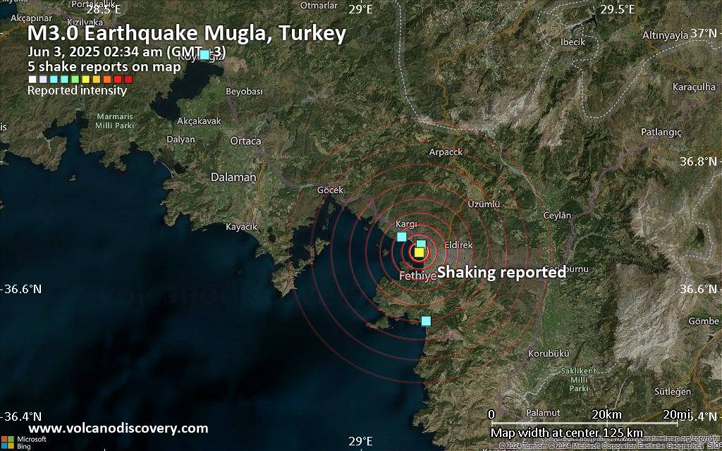 Earthquake data: Date & time: Jun 3, 2025 02:34 am (GMT +3) local time (2 Jun 2025 23:34 GMT)Magnitude: unspecified Depth: unspecified Epicenter latitude / longitude: 36.66°N / 29.11°E  ( Mugla, Turkey) Primary data source: VolcanoDiscoveryhttps://www.volcanodiscovery.com/earthquake/news/272720/Seismic-like-event-possible-earthquake-reported-about-10-minutes-ago-near-Fethiye-Mula-Turkey.html