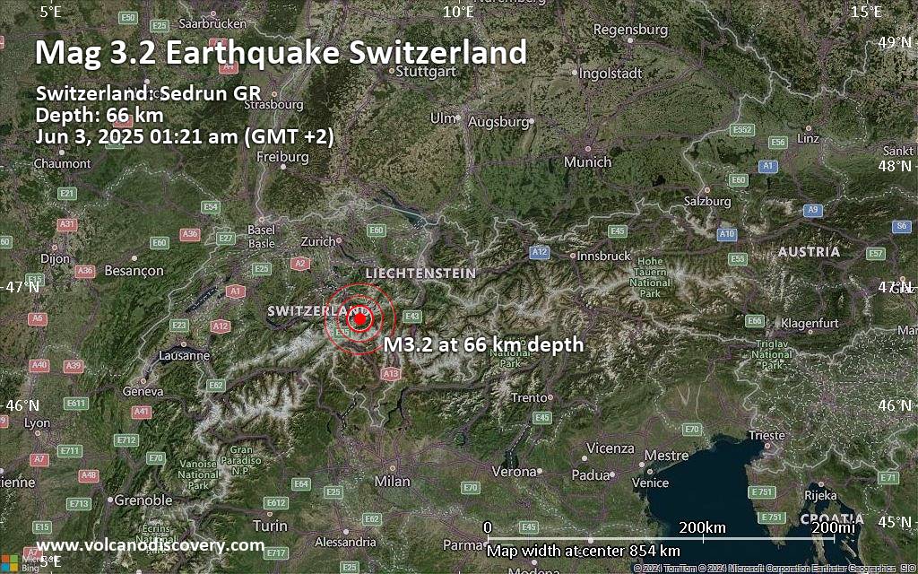 Earthquake data: Date & time: Jun 3, 2025 01:21 am (GMT +2) local time (2 Jun 2025 23:21 GMT)Magnitude: 3.2 Depth: 65.70 km Epicenter latitude / longitude: 46.73°N / 8.79°E  (Region Surselva, Kanton Graubuenden, Switzerland) Primary data source: SEDhttps://www.volcanodiscovery.com/earthquake/news/272712/Small-32-quake-hits-near-Chur-Plessur-Kanton-Graubuenden-Switzerland.html