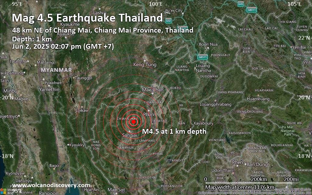 Earthquake data: Date & time: Jun 2, 2025 02:07 pm (GMT +7) local time (2 Jun 2025 07:07 GMT)Magnitude: 4.5 Depth: 1.00 km Epicenter latitude / longitude: 19.18°N / 99.19°E  (Amphoe Phrao, Thailand) Primary data source: TMDhttps://www.volcanodiscovery.com/earthquake/news/272675/Magnitude-45-earthquake-strikes-near-Chiang-Mai-Mueang-Chiang-Mai-Chiang-Mai-Province-Thailand.html