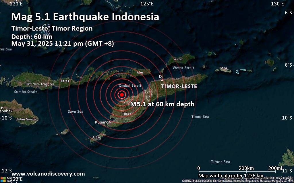 Significant earthquake of magnitude 5.1 just reported 60 km northwest of Kefamenanu, Indonesia Indonesia was shaken near Kefamenanu, North Central Timor Regency, East Nusa Tenggara, by an earthquake of magnitude 5.1 only 6 minutes ago, Indonesia's Meteorology, Climatology, and Geophysical Agency reported. The quake hit at a moderately shallow depth of 60. km beneath the epicenter near Kefamenanu, North Central Timor Regency, East Nusa Tenggara, Indonesia, late at night on Saturday, May 31st, 2025, at 11:21 pm local time. The exact magnitude, epicenter, and depth of the quake might be revised within the next few hours or minutes as seismologists review data and refine their calculations, or as other agencies issue their report. Based on the preliminary seismic data, the quake should not have caused any significant damage, but was probably felt by many people as light vibration in the area of the epicenter. Weak shaking might have been felt in Kefamenanu (pop. 48,200) located 60 km from the epicenter, Naisano Dua (pop. 2,300) 60 km away, Soe (pop. 40,200) 86 km away, Atambua (pop. 82,200) 94 km away, and Kupang (pop. 442,800) 125 km away. VolcanoDiscovery will automatically update magnitude and depth if these change and follow up if other significant news about the quake become available. If you’re in the area, please send us your experience through our reporting mechanism, either online or via our mobile app. This will help us provide more first-hand updates to anyone around the globe who wants to know more about this quake.