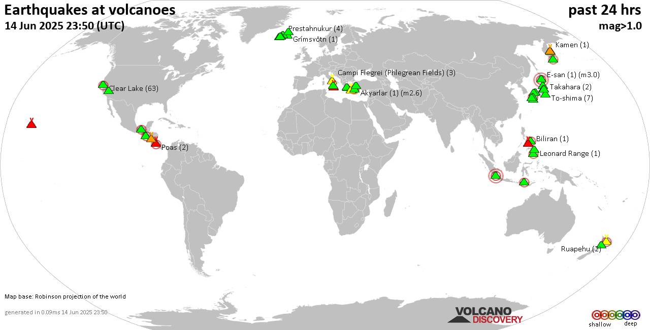 Volcano earthquake report for Saturday, 14 Jun 2025 World map showing volcanoes with shallow (less than 50 km) earthquakes within 20 km radius during the past 24 hours on 14 Jun 2025 Number in brackets indicate nr of quakes. Quakes detected near: Akyarlar (1 quake mag 2.6), Balut (2 quakes between mag 2.9-2.9), Biliran (1 quake mag 2.4), Brennisteinsfjöll (20 quakes between mag 0.1-1.5), Campi Flegrei (Phlegrean Fields) (3 quakes between mag 0.2-1.2), Canlaon (1 quake mag 2.0) Clear Lake (63 quakes between mag 0.0-2.4), Coso (3 quakes between mag 0.5-1.1), Daisen (2 quakes between mag 0.2-1.2), E-san (1 quake mag 3.0), El Chichón (4 quakes between mag 2.1-2.6), Eldey (1 quake mag 1.1), Etna (2 quakes between mag 0.9-1.7), Grímsvötn (1 quake mag 1.4), Hijiori (1 quake mag 1.2), Hiuchi (1 quake mag 1.0), Hulubelu (1 quake mag 3.6), Kamen (1 quake mag 1.2), Kilauea (2 quakes between mag 1.9-2.9), Kirishima (6 quakes between mag 0.4-1.5), Klyuchevskoy (5 quakes between mag 0.8-1.6), Kolumbo (10 quakes between mag 0.0-1.9), Krísuvík (3 quakes between mag 0.1-1.0), Ksudach (1 quake mag 2.1), Kuju (3 quakes between mag 0.4-2.2), Leonard Range (1 quake mag 2.1), Lipari (6 quakes between mag 1.1-3.3), Methana (2 quakes between mag 1.1-1.6), Moyuta (2 quakes between mag 1.8-2.0), Nantai (1 quake mag 1.7), Poas (2 quakes between mag 1.4-2.2), Poco Leok (1 quake mag 2.8), Prestahnukur (4 quakes between mag 1.1-1.8), Ruapehu (2 quakes between mag 0.6-1.0), Sanbe (3 quakes between mag 0.2-1.2), Sandal (1 quake mag 1.0), Santorini (1 quake mag 1.8), Sousaki (1 quake mag 2.2), Takahara (2 quakes between mag 0.6-1.2), Telica (1 quake mag 1.8), Tjörnes Fracture Zone (6 quakes between mag 0.2-1.1), To-shima (7 quakes between mag 0.8-1.5), Udina (2 quakes between mag 0.9-1.4), Unzen (1 quake mag 1.3), White Island (1 quake mag 2.5) (updated 23h50) Note: Earthquakes within 20 km from and at depths less than 50 km under active volcanoes are reported. The list is not complete because many volcanoes are not monitored and/or seismic data in high resolution is not available publicly.