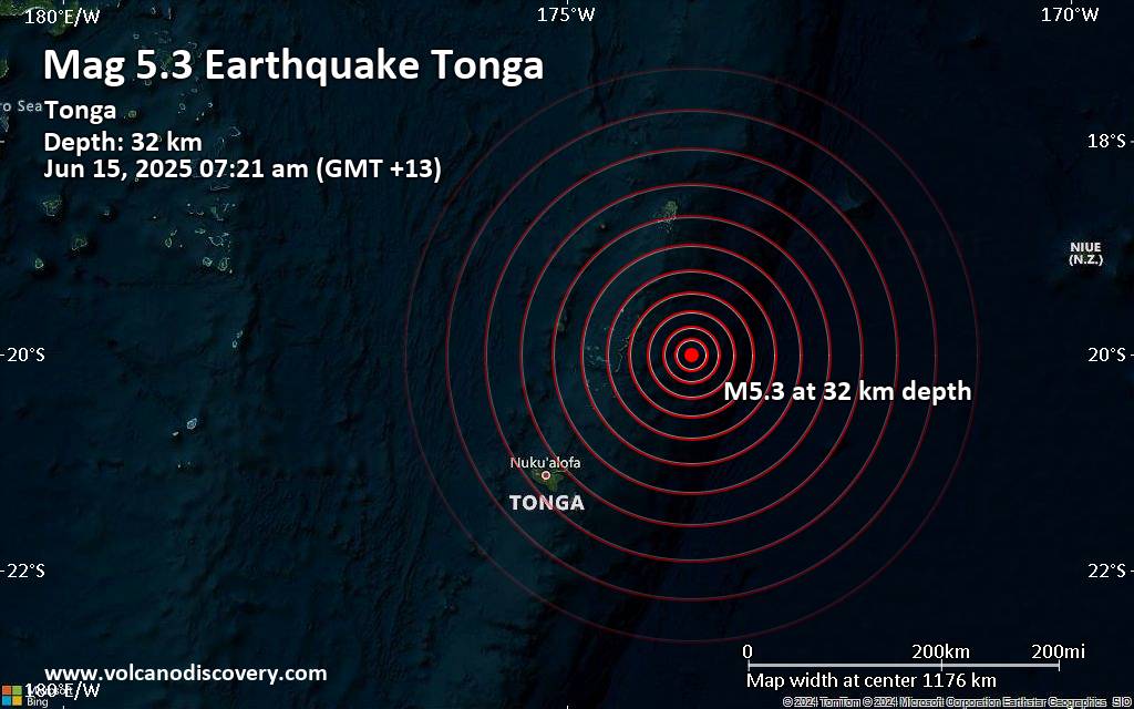 Significant earthquake of magnitude 5.3 just reported 65 km southeast of Fangale'ounga, Tonga A magnitude 5.3 earthquake near Fangale'ounga, Ha'apai, Tonga, was reported only 14 minutes ago by the European-Mediterranean Seismological Centre (EMSC), considered one of the key international agencies that monitor seismic activity worldwide. The earthquake occurred at a moderately shallow depth of 32. km beneath the epicenter in the morning on Sunday, June 15th, 2025, at 7:21 am local time. The exact magnitude, epicenter, and depth of the quake might be revised within the next few hours or minutes as seismologists review data and refine their calculations, or as other agencies issue their report. A second report was later issued by the citizen-seismograph network of RaspberryShake, which listed it as a magnitude 5.4 earthquake. A third agency, the German Research Centre for Geosciences (GFZ), reported the same quake at magnitude 5.4. Based on the preliminary seismic data, the quake should not have caused any significant damage, but was probably felt by many people as light vibration in the area of the epicenter. Weak shaking might have been felt in Fangale'ounga (pop. 2,000) located 65 km from the epicenter. VolcanoDiscovery will automatically update magnitude and depth if these change and follow up if other significant news about the quake become available. If you’re in the area, please send us your experience through our reporting mechanism, either online or via our mobile app. This will help us provide more first-hand updates to anyone around the globe who wants to know more about this quake.