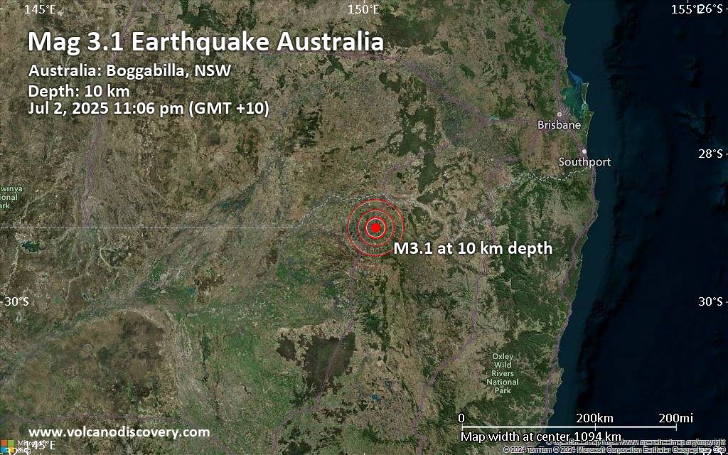 Earthquake data: Date & time: Jul 2, 2025 11:06 pm (GMT +10) local time (2 Jul 2025 13:06 GMT)Magnitude: 3.1 Depth: 9.51 km Epicenter latitude / longitude: 29.01°S / 150.18°E  ( Moree Plains, New South Wales, Australia) Primary data source: GeoAuhttps://www.volcanodiscovery.com/earthquake/news/274620/Small-magnitude-31-earthquake-33-miles-southwest-of-Goondiwindi-New-South-Wales-Australia.html