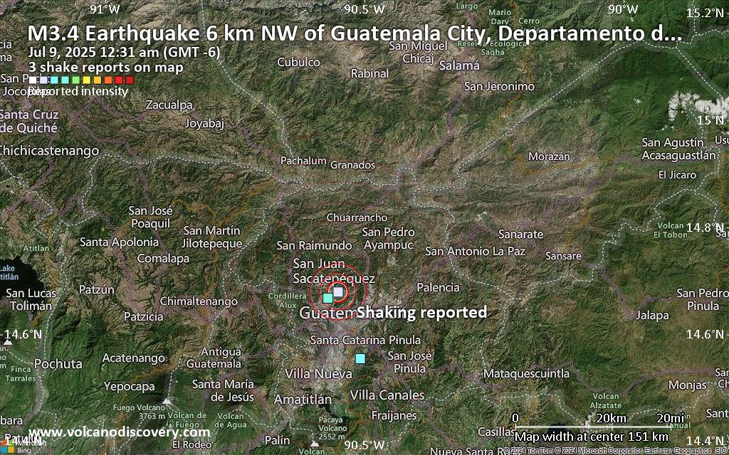 Earthquake data: Date & time: Jul 9, 2025 12:31 am (GMT -6) local time (9 Jul 2025 06:31 GMT)Magnitude: unspecified Depth: unspecified Epicenter latitude / longitude: 14.68°N / 90.55°W  ( Departamento de Guatemala, Guatemala) Primary data source: VolcanoDiscoveryhttps://www.volcanodiscovery.com/earthquake/news/275157/Seismic-like-event-possible-earthquake-reported-few-minutes-ago-near-Guatemala-City-Guatemala.html