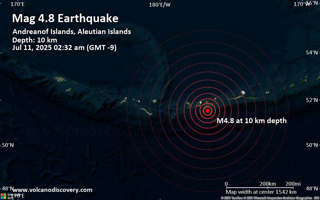 Moderate 4.8 quake hits near Adak, Aleutians West, Alaska, USA The German Research Centre for Geosciences (GFZ) reported a magnitude 4.8 quake in the United States near Adak, Aleutians West, Alaska, only 19 minutes ago. The earthquake hit early morning on Friday, July 11th, 2025, at 2:32 am local time at a shallow depth of 6.2 miles. The exact magnitude, epicenter, and depth of the quake might be revised within the next few hours or minutes as seismologists review data and refine their calculations, or as other agencies issue their report. Based on the preliminary seismic data, the quake should not have caused any significant damage, but was probably felt by many people as light vibration in the area of the epicenter. Weak shaking might have been felt in Adak (pop. 330) located 24 miles from the epicenter. VolcanoDiscovery will automatically update magnitude and depth if these change and follow up if other significant news about the quake become available. If you’re in the area, please send us your experience through our reporting mechanism, either online or via our mobile app. This will help us provide more first-hand updates to anyone around the globe who wants to know more about this quake.