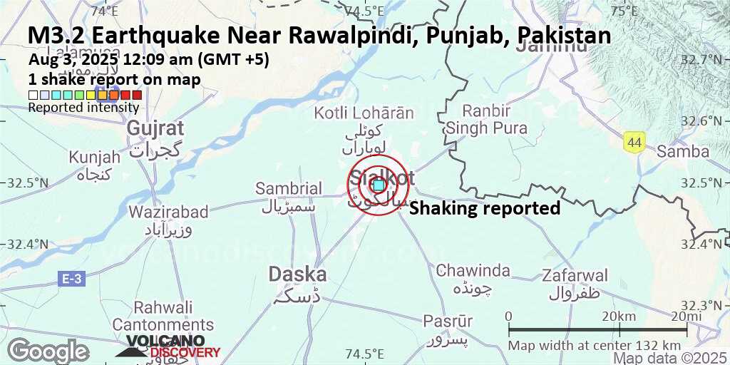 Earthquake data: Date & time: Aug 3, 2025 12:09 am (GMT +5) local time (2 Aug 2025 19:09 GMT)Magnitude: unspecified Depth: unspecified Epicenter latitude / longitude: 32.5°N / 74.53°E  ( Punjab Province, Pakistan) Primary data source: VolcanoDiscoveryhttps://www.volcanodiscovery.com/earthquake/news/277111/Seismic-like-event-possible-earthquake-reported-about-10-minutes-ago-near-Rawalpindi-Punjab-Pakistan.html
