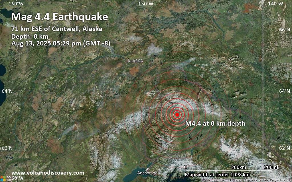 Moderate magnitude 4.4 quake hits 44 miles southeast of Cantwell, Alaska, United States in the afternoon An earthquake of magnitude 4.4 occurred in the afternoon on Wednesday, August 13th, 2025, at 5:29 pm local time near Cantwell, Denali, Alaska, USA, as reported by the United States Geological Survey. According to preliminary data, the quake was located at a very shallow depth of miles. Shallow earthquakes are felt more strongly than deeper ones as they are closer to the surface. The exact magnitude, epicenter, and depth of the quake might be revised within the next few hours or minutes as seismologists review data and refine their calculations, or as other agencies issue their report. Our monitoring service identified a second report from The Incorporated Research Institutions for Seismology (IRIS) which listed the quake at magnitude 4.4 as well. Towns or cities near the epicenter where the quake might have been felt as very weak shaking include Cantwell (pop. 220) located 44 miles from the epicenter. VolcanoDiscovery will automatically update magnitude and depth if these change and follow up if other significant news about the quake become available. If you’re in the area, please send us your experience through our reporting mechanism, either online or via our mobile app. This will help us provide more first-hand updates to anyone around the globe who wants to know more about this quake.