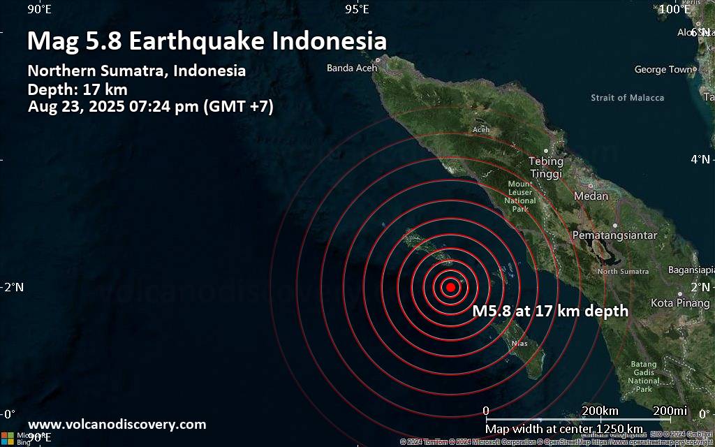 Earthquake data: Date & time: Aug 23, 2025 07:24 pm (GMT +7) local time (23 Aug 2025 12:24 GMT)Magnitude: 5.8 Depth: 17.00 km Epicenter latitude / longitude: 2°N / 96.47°E  (Simeulue Regency, Nanggroe Aceh Darussalam Province, Indonesia) Primary data source: BMKGhttps://www.volcanodiscovery.com/earthquake/news/278739/Significant-earthquake-of-magnitude-58-just-reported-54-km-south-of-Sinabang-Indonesia.html