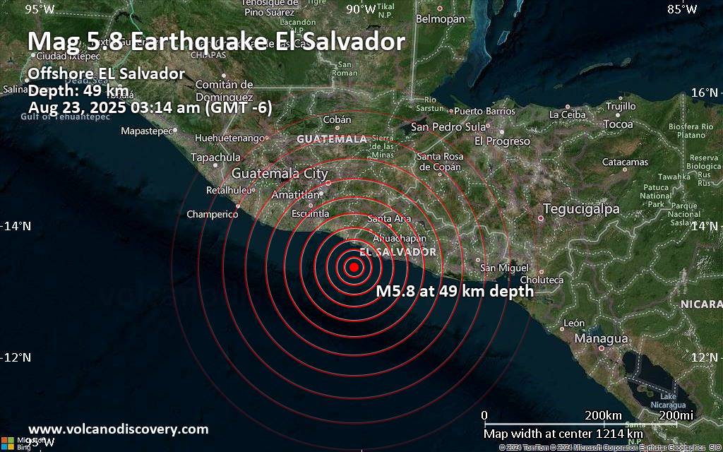 Earthquake data: Date & time: Aug 23, 2025 03:14 am (GMT -6) local time (23 Aug 2025 09:14 GMT)Magnitude: 5.8 Depth: 49.00 km Epicenter latitude / longitude: 13.37°N / 90.11°W  ( Departamento de San Salvador, El Salvador) Primary data source: EMSChttps://www.volcanodiscovery.com/earthquake/news/278710/Significant-magnitude-58-quake-hits-39-km-southwest-of-Acajutla-El-Salvador-early-morning-.html