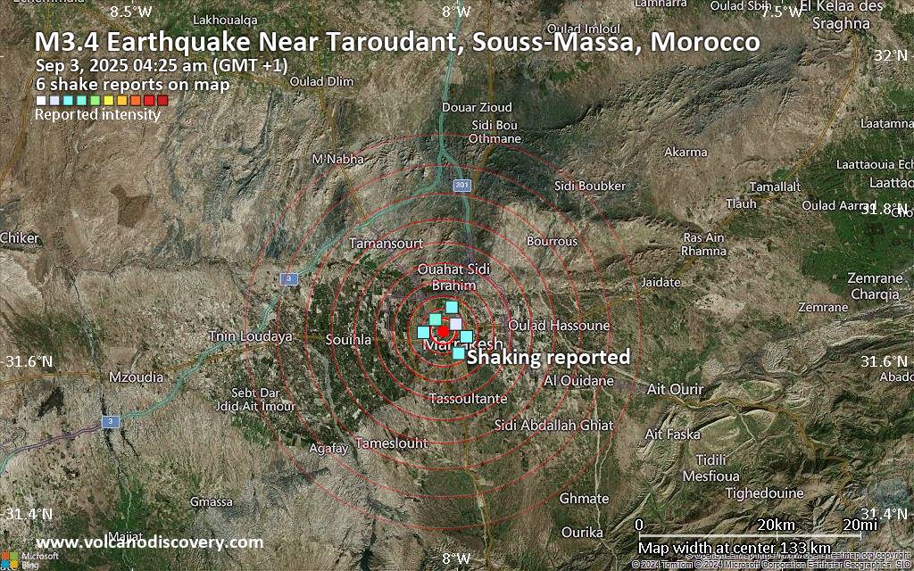 Earthquake data: Date & time: Sep 3, 2025 04:25 am (GMT +1) local time (3 Sep 2025 03:25 GMT)Magnitude: unspecified Depth: unspecified Epicenter latitude / longitude: 31.64°N / 8.02°W  ( Souss-Massa, Morocco) Primary data source: VolcanoDiscoveryhttps://www.volcanodiscovery.com/earthquake/news/279712/Seismic-like-event-possible-earthquake-reported-few-minutes-ago-near-Taroudant-Souss-Massa-Morocco.html