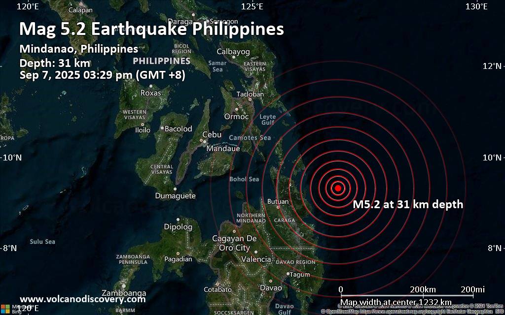 The quake hit at a moderately shallow depth of 31. km beneath the epicenter near Tandag, Surigao del Sur, Caraga, Philippines, early afternoon on Sunday, September 7th, 2025, at 3:29 pm local time. The exact magnitude, epicenter, and depth of the quake might be revised within the next few hours or minutes as seismologists review data and refine their calculations, or as other agencies issue their report.