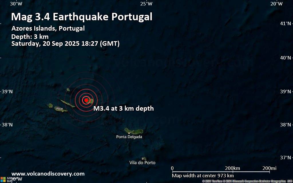 Magnitude 3.4 earthquake strikes near Angra do Heroismo, Angra do Heroísmo Municipality, Azores, Portugal An earthquake of magnitude 3.4 occurred early evening on Saturday, September 20th, 2025, at 6:27 pm local time near Angra do Heroismo, Angra do Heroísmo Municipality, Azores, Portugal, as reported by the European-Mediterranean Seismological Centre (EMSC). According to preliminary data, the quake was located at a very shallow depth of 2.70 km. Shallow earthquakes are felt more strongly than deeper ones as they are closer to the surface. The exact magnitude, epicenter, and depth of the quake might be revised within the next few hours or minutes as seismologists review data and refine their calculations, or as other agencies issue their report. A second report was later issued by the Portuguese Institute for Sea and Atmosphere (Instituto Português do Mar e da Atmosfera, IPMA), which listed it as a magnitude 3.4 earthquake as well. A third agency, the citizen-seismograph network of RaspberryShake, reported the same quake at magnitude 3.4. Based on the preliminary seismic data, the quake should not have caused any significant damage, but was probably felt by many people as light vibration in the area of the epicenter. Weak shaking might have been felt in Santa Barbara (pop. 1,300) located 5 km from the epicenter, Sao Bartolomeu (pop. 2,000) 8 km away, Biscoitos (pop. 1,400) 8 km away, Sao Mateus (pop. 3,800) 10 km away, and Angra do Heroismo (pop. 12,000) 13 km away. Other towns or cities near the epicenter where the quake might have been felt as very weak shaking include Ribeirinha (pop. 2,700) located 15 km from the epicenter, Lajes (pop. 3,700) 19 km away, and Praia da Vitoria (pop. 6,100) 22 km away.