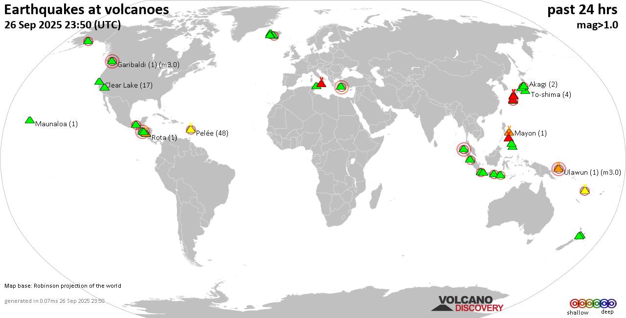 Volcano earthquake report for Friday, 26 Sep 2025 World map showing volcanoes with shallow (less than 50 km) earthquakes within 20 km radius during the past 24 hours on 26 Sep 2025 Number in brackets indicate nr of quakes. Quakes detected near: Akagi (2 quakes between mag 0.7-2.2), Akuseki-jima (2 quakes between mag 1.8-2.1), Ambrym (1 quake mag 2.7), Baluran (1 quake mag 2.7), Brennisteinsfjöll (1 quake mag 1.4), Canlaon (2 quakes between mag 1.7-2.2) Clear Lake (17 quakes between mag 0.2-1.5), Coso (2 quakes between mag 0.8-1.0), El Chichón (3 quakes between mag 2.3-2.9), Etna (5 quakes between mag 1.0-3.0), Eyafjallajökull (2 quakes between mag 1.3-2.0), Gagak (10 quakes between mag 2.1-2.9), Garibaldi (1 quake mag 3.0), Geureudong (1 quake mag 3.0), Hengill (1 quake mag 1.9), Hiuchi (3 quakes between mag 0.4-1.2), Ilopango (1 quake mag 3.0), Kawah Karaha (1 quake mag 3.0), Kirishima (3 quakes between mag 0.1-1.3), Krísuvík (15 quakes between mag 0.6-1.7), Laguna Aramuaca (1 quake mag 1.6), Ljósufjöll (7 quakes between mag 0.0-2.5), Maunaloa (1 quake mag 1.5), Mayon (1 quake mag 2.5), Nisyros (1 quake mag 3.4), Ontake-san (2 quakes between mag 0.1-1.0), Pantelleria (1 quake mag 1.2), Parker (1 quake mag 1.7), Pelée (48 quakes between mag 0.2-2.1), Ragang (1 quake mag 3.1), Redoubt (1 quake mag 2.1), Rota (1 quake mag 1.0), Ruapehu (1 quake mag 1.7), Sakurajima (1 quake mag 1.4), San Cristobal (1 quake mag 2.1), Suwanose-jima (5 quakes between mag 1.4-1.8), Takahara (1 quake mag 1.2), Tambora (1 quake mag 2.1), Tandikat (1 quake mag 2.0), Taupo (1 quake mag 1.8), Tindfjallajökull (1 quake mag 2.0), To-shima (4 quakes between mag 0.7-2.0), Ulawun (1 quake mag 3.0) (updated 23h50) Note: Earthquakes within 20 km from and at depths less than 50 km under active volcanoes are reported. The list is not complete because many volcanoes are not monitored and/or seismic data in high resolution is not available publicly.