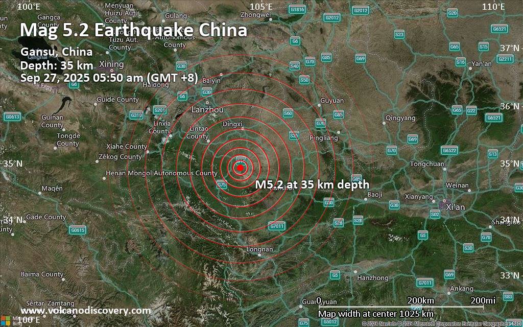 Earthquake data: Date & time: Sep 27, 2025 05:50 am (GMT +8) local time (26 Sep 2025 21:50 GMT)Magnitude: 5.2 Depth: 35.00 km Epicenter latitude / longitude: 34.93°N / 104.54°E  ( Dingxi Shi, Gansu, China) Primary data source: EMSChttps://www.volcanodiscovery.com/earthquake/news/281852/Magnitude-52-earthquake-strikes-near-Wushan-Tianshui-Shi-Gansu-China.html