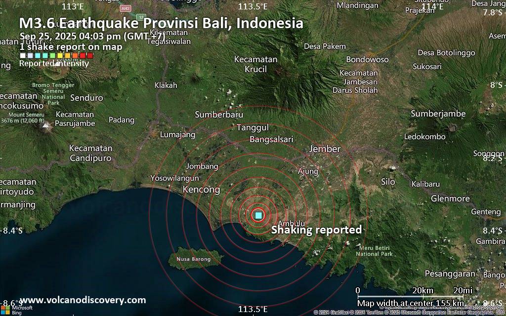 Earthquake data: Date & time: Sep 25, 2025 04:03 pm (GMT +7) local time (25 Sep 2025 09:03 GMT)Magnitude: unspecified Depth: unspecified Epicenter latitude / longitude: 8.36°S / 113.51°E  ( Provinsi Bali, Indonesia) Primary data source: VolcanoDiscoveryhttps://www.volcanodiscovery.com/earthquake/news/281715/Seismic-like-event-possible-earthquake-reported-few-minutes-ago-near-Denpasar-Bali-Indonesia.html