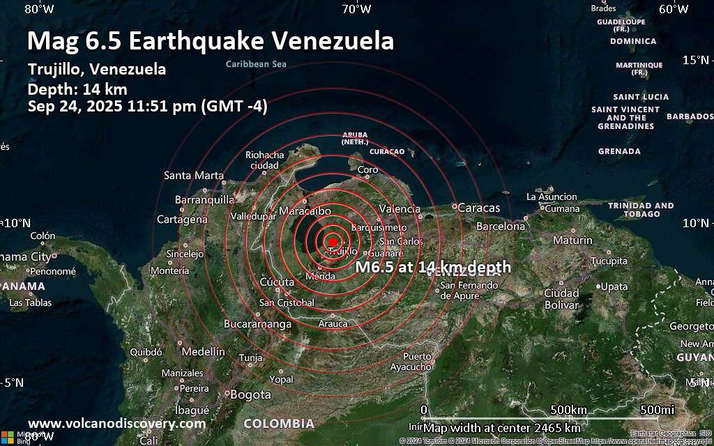 Significant magnitude 6.5 quake hits 20 km northwest of Valera, Venezuela late at night An earthquake of magnitude 6.5 occurred only 5 minutes ago 20 km northwest of Valera, Venezuela, the European-Mediterranean Seismological Centre (EMSC) reported. The quake hit at a shallow depth of 14. km beneath the epicenter near Valera, Valera Municipality, Estado Trujillo, Venezuela, late at night on Wednesday, September 24th, 2025, at 11:51 pm local time. The exact magnitude, epicenter, and depth of the quake might be revised within the next few hours or minutes as seismologists review data and refine their calculations, or as other agencies issue their report. A second report was later issued by The Colombian Geological Service (SGC), which listed it as a magnitude 7.2 earthquake. Based on the preliminary seismic data, the quake should have been felt by everybody in the area of the epicenter. In those areas, dangerous ground shaking occurred with the potential to inflict moderate to heavy damage to buildings and other infrastructure. Towns or cities where the quake likely caused strong ground shaking include Moderate shaking probably occurred in Pampanito (pop. 35,800) located 29 km from the epicenter, Pampan (pop. 59,700) 32 km away, and Trujillo (pop. 71,400) 36 km away. VolcanoDiscovery will automatically update magnitude and depth if these change and follow up if other significant news about the quake become available. If you’re in the area, please send us your experience through our reporting mechanism, either online or via our mobile app. This will help us provide more first-hand updates to anyone around the globe who wants to know more about this quake.