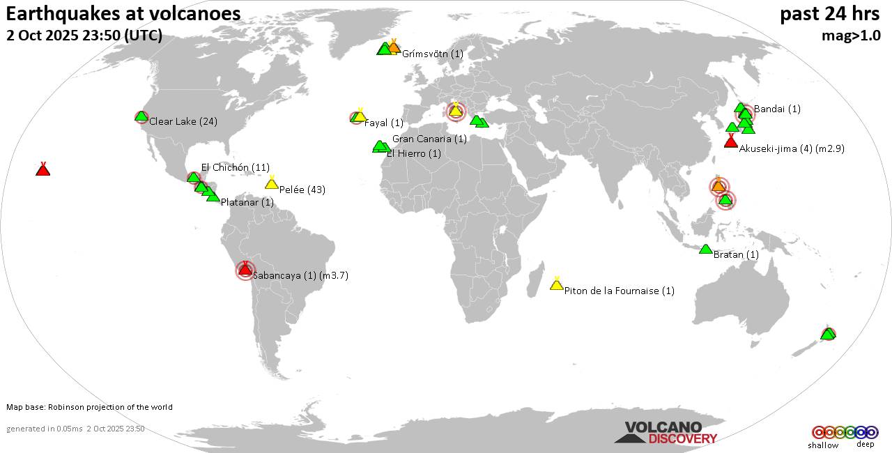 Volcano earthquake report for Thursday, 2 Oct 2025 World map showing volcanoes with shallow (less than 50 km) earthquakes within 20 km radius during the past 24 hours on 2 Oct 2025 Number in brackets indicate nr of quakes. Quakes detected near: Akagi (1 quake mag 1.1), Akita-Yake-yama (1 quake mag 1.2), Akuseki-jima (4 quakes between mag 1.5-2.9), Bandai (1 quake mag 1.0), Bardarbunga (6 quakes between mag 0.1-1.8), Bratan (1 quake mag 1.8) Campi Flegrei (Phlegrean Fields) (59 quakes between mag 0.1-3.0), Cerro Singüil (3 quakes between mag 2.1-2.8), Clear Lake (24 quakes between mag 0.2-2.2), Coatepeque (1 quake mag 1.9), Cuernos de Negros (1 quake mag 3.0), El Chichón (11 quakes between mag 1.5-2.5), El Hierro (1 quake mag 1.7), Eldey (1 quake mag 1.9), Fayal (1 quake mag 2.3), Gran Canaria (1 quake mag 1.1), Grímsvötn (1 quake mag 1.1), Hachimantai (1 quake mag 3.0), Iwate (2 quakes between mag 0.9-3.0), Katla (1 quake mag 1.0), Kilauea (3 quakes between mag 0.6-3.4), Kolumbo (7 quakes between mag 0.7-1.9), Komaga-take (3 quakes between mag 0.5-1.3), Krísuvík (10 quakes between mag 0.5-1.5), Kusatsu-Shirane (1 quake mag 1.2), La Palma (1 quake mag 1.8), Ljósufjöll (53 quakes between mag 0.4-3.2), Maroa (1 quake mag 2.1), Mauna Kea (2 quakes between mag 2.0-2.5), Maunaloa (1 quake mag 1.8), Methana (1 quake mag 3.1), Momotombo (1 quake mag 1.5), Pelée (43 quakes between mag 0.1-1.1), Piton de la Fournaise (1 quake mag 1.1), Platanar (1 quake mag 1.6), Rotorua (1 quake mag 2.1), Sabancaya (1 quake mag 3.7), Sanbe (1 quake mag 1.6), Suwanose-jima (13 quakes between mag 1.3-3.1), Taal (1 quake mag 3.0), Taupo (1 quake mag 2.0), Terceira (1 quake mag 3.0), To-shima (5 quakes between mag 0.8-1.6) (updated 23h50) Note: Earthquakes within 20 km from and at depths less than 50 km under active volcanoes are reported. The list is not complete because many volcanoes are not monitored and/or seismic data in high resolution is not available publicly.