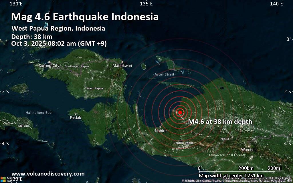 Moderate magnitude 4.6 quake hits 107 km northeast of Nabire, Indonesia in the morning Indonesia's Meteorology, Climatology, and Geophysical Agency reported a magnitude 4.6 quake in Indonesia near Nabire, Nabire Regency, Central Papua, only 6 minutes ago. The earthquake hit in the morning on Friday, October 3rd, 2025, at 8:02 am local time at a moderately shallow depth of 38. km. The exact magnitude, epicenter, and depth of the quake might be revised within the next few hours or minutes as seismologists review data and refine their calculations, or as other agencies issue their report. Towns or cities near the epicenter where the quake might have been felt as very weak shaking include Nabire (pop. 43,900) located 107 km from the epicenter. VolcanoDiscovery will automatically update magnitude and depth if these change and follow up if other significant news about the quake become available. If you’re in the area, please send us your experience through our reporting mechanism, either online or via our mobile app. This will help us provide more first-hand updates to anyone around the globe who wants to know more about this quake.