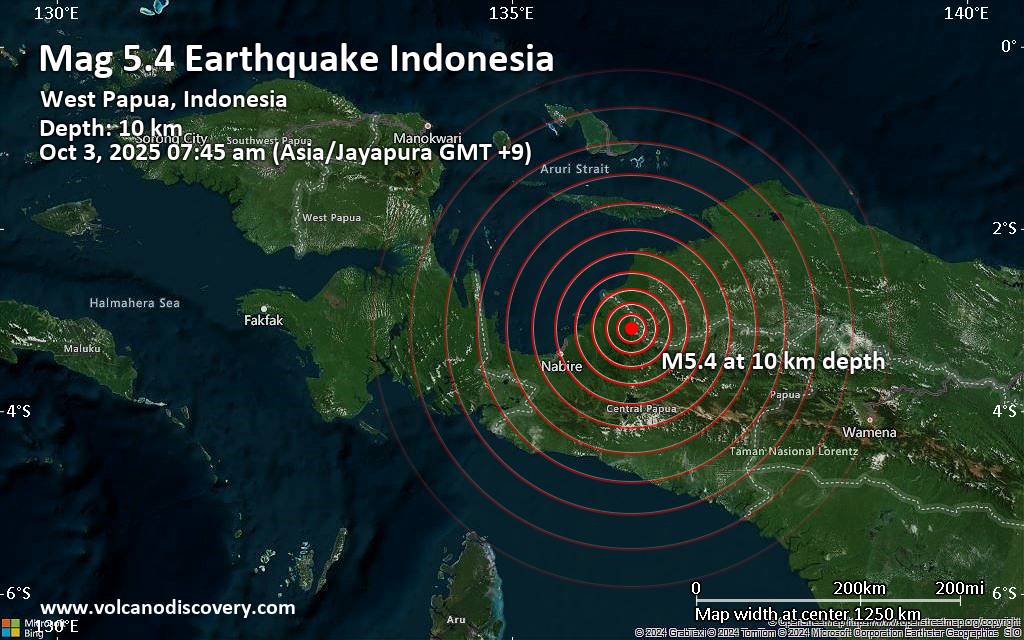 Significant earthquake of magnitude 5.4 just reported 95 km northeast of Nabire, Indonesia Indonesia was shaken near Nabire, Nabire Regency, Central Papua, by an earthquake of magnitude 5.4 only 9 minutes ago, the German Research Centre for Geosciences (GFZ) reported. The quake hit at a shallow depth of 10. km beneath the epicenter near Nabire, Nabire Regency, Central Papua, Indonesia, in the morning on Friday, October 3rd, 2025, at 7:45 am local time. Shallow earthquakes are felt more strongly than deeper ones as they are closer to the surface. The exact magnitude, epicenter, and depth of the quake might be revised within the next few hours or minutes as seismologists review data and refine their calculations, or as other agencies issue their report. Our monitoring service identified a second report from the citizen-seismograph network of RaspberryShake which listed the quake at magnitude 5.5. Based on the preliminary seismic data, the quake should not have caused any significant damage, but was probably felt by many people as light vibration in the area of the epicenter. Weak shaking might have been felt in Nabire (pop. 43,900) located 95 km from the epicenter. VolcanoDiscovery will automatically update magnitude and depth if these change and follow up if other significant news about the quake become available. If you’re in the area, please send us your experience through our reporting mechanism, either online or via our mobile app. This will help us provide more first-hand updates to anyone around the globe who wants to know more about this quake.