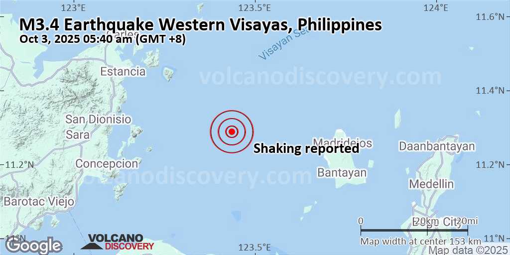 Earthquake data: Date & time: Oct 3, 2025 05:40 am (GMT +8) local time (2 Oct 2025 21:40 GMT)Magnitude: unspecified Depth: unspecified Epicenter latitude / longitude: 11.29°N / 123.44°E  ( Western Visayas, Philippines) Primary data source: VolcanoDiscoveryhttps://www.volcanodiscovery.com/earthquake/news/282431/Seismic-like-event-possible-earthquake-reported-few-minutes-ago-near-Passi-Western-Visayas-Philippin.html